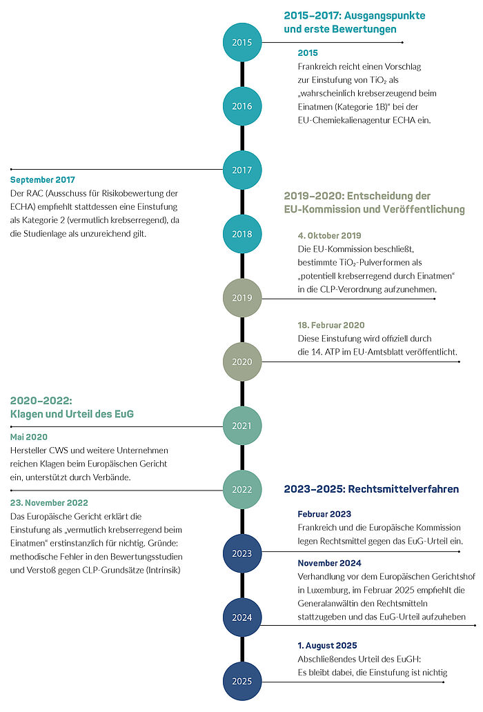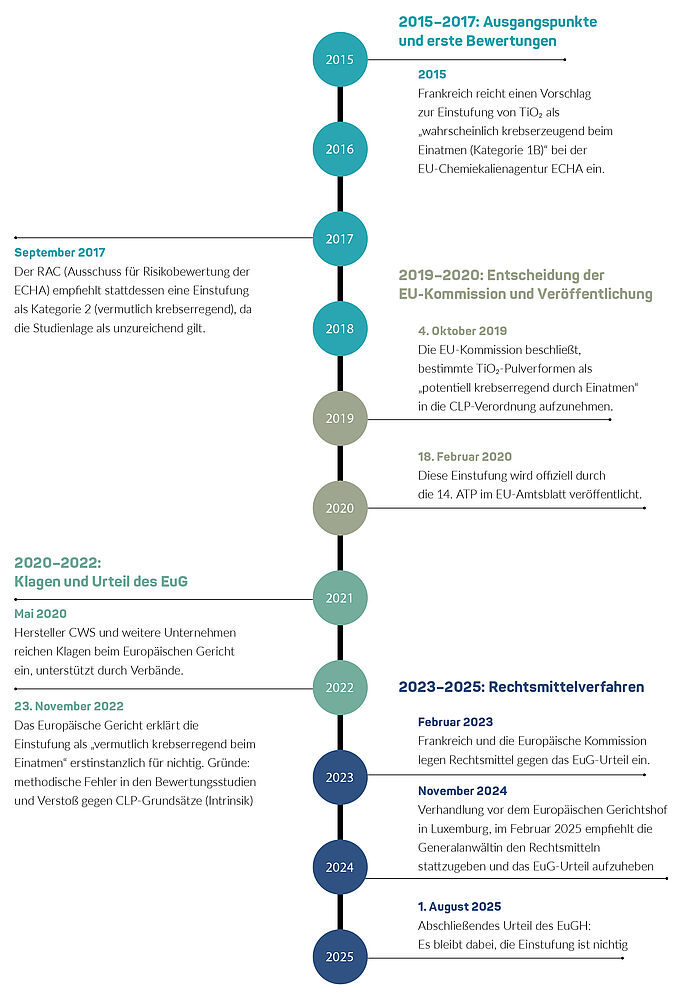 Unstrittig war stets, dass Titandioxid immer fest in den Farbfilm eingebunden ist und folglich nicht mehr eingeatmet werden kann. Zuletzt ging es um Titandioxid in Pulverform mit einem Gehalt von mindestens einem Prozent Titandioxid in Partikelform oder eingebunden in Partikel mit einem aerodynamischen Durchmesser von höchstens zehn Mikrometer. Titandioxid wurde damit nicht verboten, musste aber mit einem Warnhinweis versehen werden.