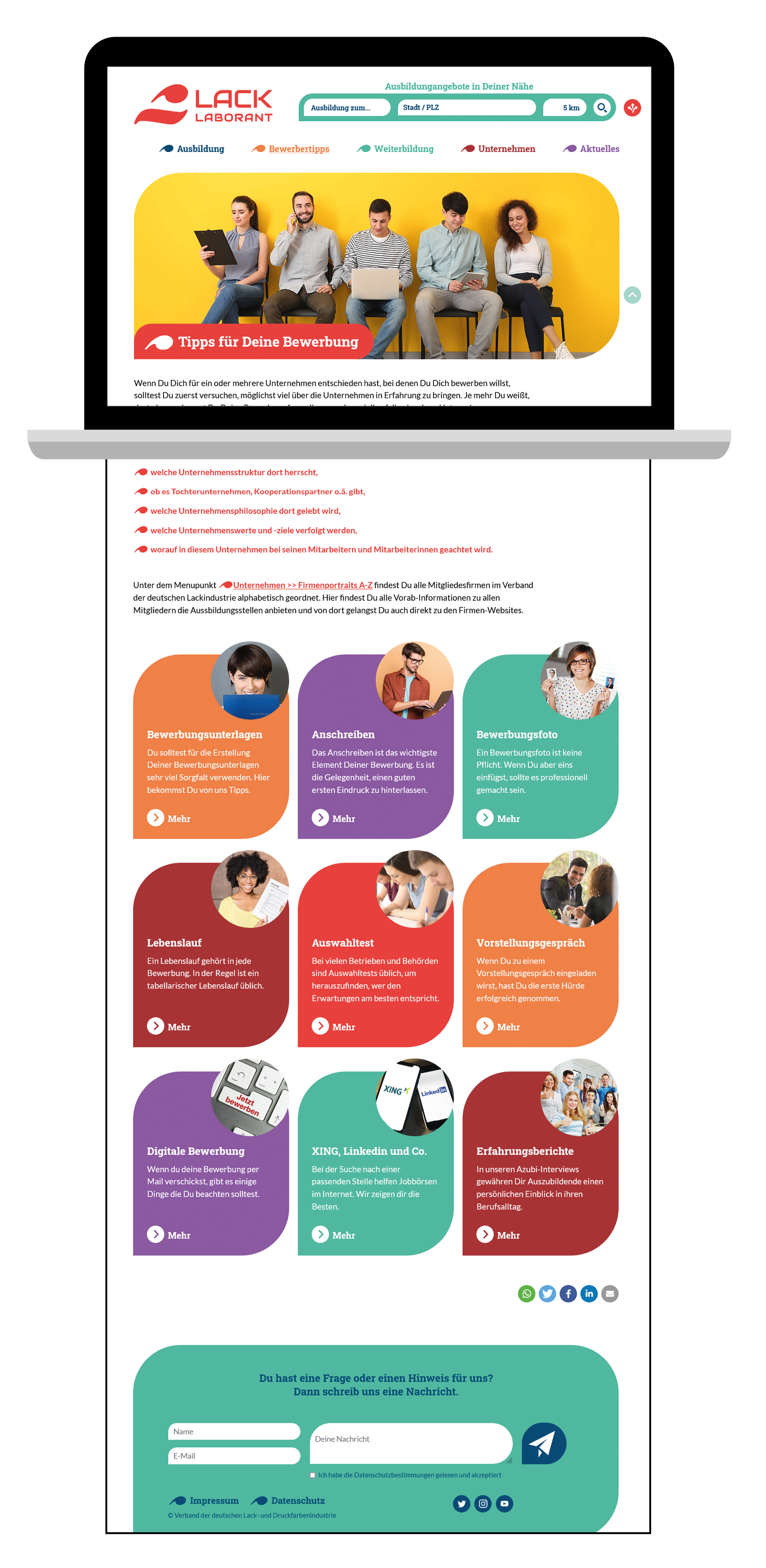 Eine Ausbildungssuche auf der Startseite zeigt alle ausbildenden Firmen im Umkreis an und führt direkt auf deren „Karriere“-Webseiten. Unter dem Stichwort „Bewerbertipps“ findet man Beispiele vom Bewerbungsschreiben bis zum Vorstellungsgespräch. Gleichzeitig ergänzen Erfahrungsberichte von Auszubildenden die Informationen rund um eine Aus- und Weiterbildung in der Lack- und Druckfarbenindustrie. Neben der Umstrukturierung und des Redesigns wurde die Website auch aktuellen technischen Möglichkeiten angepasst: Sie bietet mehr Videoformate, ist jetzt über Suchmaschinen besser zu finden und auf allen Endgeräten einwandfrei nutzbar.