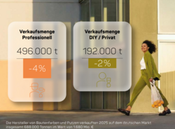 2025 wurden Bautenanstrichmittel im Wert von rund 1,7 Milliarden Euro im deutschen Markt umgesetzt. Die verkaufte Menge der Bautenfarben und Putze verzeichnete einen deutlichen Rückgang um 3,5 %. Ein Grund für die negative Entwicklung sind unter anderem die rückläufigen Umsätze im Wohnungsbau. Der DIY-Bereich wies im Jahr 2025 einen Rückgang um 2 % auf, während der Profi-Bereich sogar um 4 % zurückging. Angesichts der sich nur langsam erholenden Bauwirtschaft zeichnet sich auch für 2026 noch keine Trendwende ab. Für die Bautenanstrichmittel erwarten wir im laufenden Jahr sogar eine weitere Reduktion der Absatzmenge um 3 %. Erst ab 2027 gehen wir von einer Erholung bei der Nachfrage aus, da erst dann wieder mit steigenden Wohnbaufertigstellungen gerechnet wird.