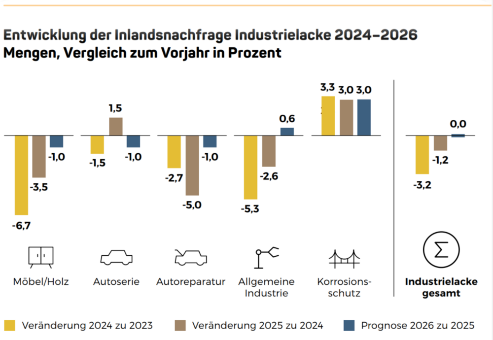 Für den deutschen Industrielackmarkt war 2025 insgesamt ein schwieriges Jahr. So ging die Inlandsnachfrage im Vergleich zum Vorjahr um 1,2 % zurück. Die schwache Entwicklung ist vor allem auf die rückläufige Nachfrage in den Bereichen Möbel und Holz, Autoreparaturlacke sowie in den meisten Segmenten der allgemeinen Industrie zurückzuführen. Entgegen diesem Trend zeigte sich jedoch sowohl bei den Autoserienlacken als auch im Korrosionsschutz eine positive Entwicklung. Die Absatzmenge von Autoserienlacken profitierte von der gestiegenen Pkw-Produktion in Deutschland und stieg um 1,5 %. Im Bereich Korrosionsschutz sorgten insbesondere die erhöhten öffentlichen Investitionen in die Verkehrsinfrastruktur für eine gestiegene Absatzmenge um 3 %. Für 2026 erwarten wir bei den Industrielacken insgesamt eine Stabilisierung der Nachfrage, zu der vor allem die Segmente der allgemeinen Industrie (u.a. Metallerzeugnisse, sonstiger Fahrzeugbau) sowie der Korrosionsschutz beitragen dürften.