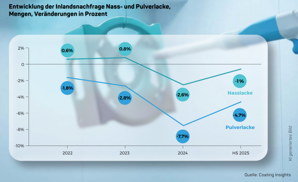 Im Industrielackmarkt kann zwischen Nass- und Pulver- lacken unterschieden werden, wobei Pulverlacke rund 12 % des Gesamtumsatzes der Industrielacke in Deutschland ausmachen. In den letzten vier Jahren fielen die Rückgänge bei den Pulverlacken stärker aus als bei den Nasslacken. Besonders ausgeprägt waren die Unterschiede in den Jahren 2024 und 2025: Während die Absatzmenge von Nasslacken 2025 nur um etwa 1 % zurückging, sank die Absatzmenge von Pulverlacken um etwa 5 %. Rund die Hälfte der Pulverlackanwendungen entfiel 2025 auf den Automobilzulieferungs- bzw. Transportbereich und auf den Baubereich. Die deutlichen Rückgänge bei den Pulverlacken sind vor allem auf eine schwache Entwicklung dieser wichtigen Anwendungsbereiche zurückzuführen.