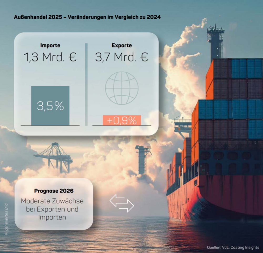 Der internationale Handel verzeichnete im Jahr 2025 sowohl bei den Exporten als auch bei den Importen leichte Steigerungen. 2025 wurden Waren im Wert von 3,7 Milliarden Euro exportiert, rund 1 % mehr als im Vorjahr. Während der Exportwert von Druckfarben leicht sank, stieg der von Lacken und Farben leicht. Aufgrund des höheren Anteils der Lacke und Farben am Gesamtwert führte dies insgesamt zu einem Anstieg des Exportwerts. Die Umsätze aus Importen stiegen 2025 um 3,5 %. Insgesamt wurden Waren im Wert von 1,3 Milliarden Euro importiert. Sowohl der Importwert von Farben und Lacken als auch von Druckfarben verzeichnete deutliche Steigerungen. Für 2026 erwarten wir moderate Zuwächse bei Exporten und Importen, begünstigt durch eine leicht anziehende Konjunktur im Inland und der moderat positiven Entwicklung im Ausland.