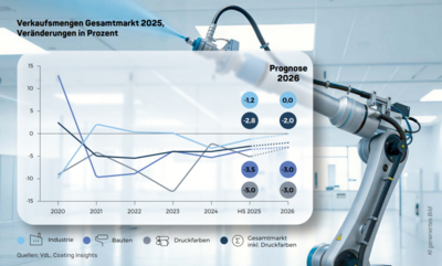 Die gesamtwirtschaftliche Schwäche hat die Lack- und Druckfarbenindustrie auch 2025 belastet. Der Inlandsabsatz sank nach den neuesten Zahlen um 2,8 %, der Umsatz ging um 1,2 % zurück. Besonders Bauten- und Druckfarben verzeichneten deutliche Einbußen. Für 2026 gibt es wohl nur vereinzelt hoffnungsvolle Aussichten.