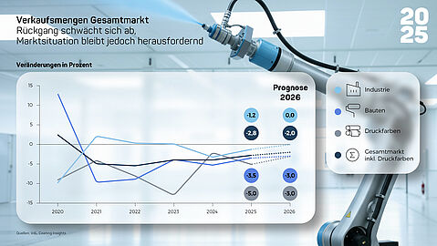Die verkauften Mengen an Bautenfarben und Putzen sind 2025 mit minus 3,5 % deutlich zurückgegangen. Grund für die negative Entwicklung sind unter anderem der nach wie vor schwache Markt im Wohnungsbau und niedrige Bauinvestitionen. Der Do-It-Yourself-Bereich (DIY) hat 2025 einen Rückgang der Menge um 2 % verzeichnet, während der Profi-Sektor sogar um 4 % zurückgegangen ist. Angesichts der anhaltend schwierigen Lage in der Bauwirtschaft zeichnet sich für 2026 ein ähnlich negatives Bild ab. Der VdL prognostiziert eine Reduktion der verkauften Mengen um erneut 3 %. Erst ab 2027 kann demnach von einer Erholung bei der Nachfrage nach Bautenanstrichmitteln ausgegangen werden – falls der wichtige „Baubooster“ dann die erhofften positiven Auswirkungen zeigt.