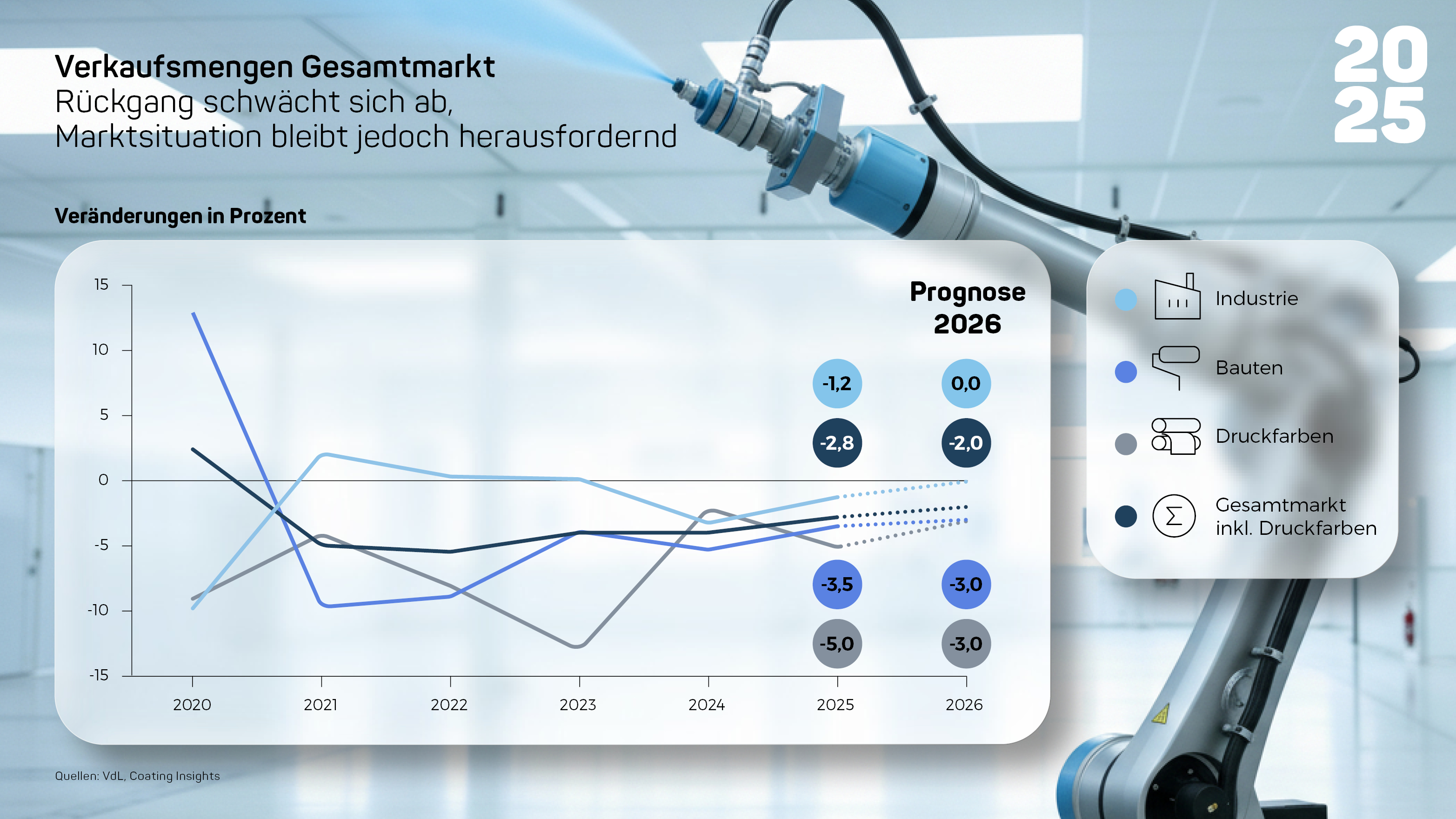 (Frankfurt am Main, 12.2.2026). Auch für das Jahr 2025 kann die deutsche Lack- und Druckfarbenindustrie fast durchweg nur negative Zahlen melden. Dem Trend der (Chemie-) Industrie folgend, musste die Branche einen Rückgang der Verkaufsmenge um 2,8 % auf 1,4 Millionen Tonnen verkraften. Der Umsatz sank im Vergleich zum Vorjahr um knapp 1,2 % auf 5,8 Milliarden Euro, berichtet VdL-Präsident Dr. Harald Borgholte auf der Jahrespressekonferenz des Verbands der deutschen Lack- und Druckfarbenindustrie e.V. (VdL). Die gesamtwirtschaftliche Schwäche belastet demnach die Lack- und Druckfarbenindustrie weiterhin erheblich, und auch für 2026 rechnen die Farbenhersteller mit einer angespannten Marktsituation: Der Verband erwartet weiter schlechte Geschäftszahlen und prognostiziert für den Gesamtmarkt einen Rückgang der Verkaufsmengen um 2 %.