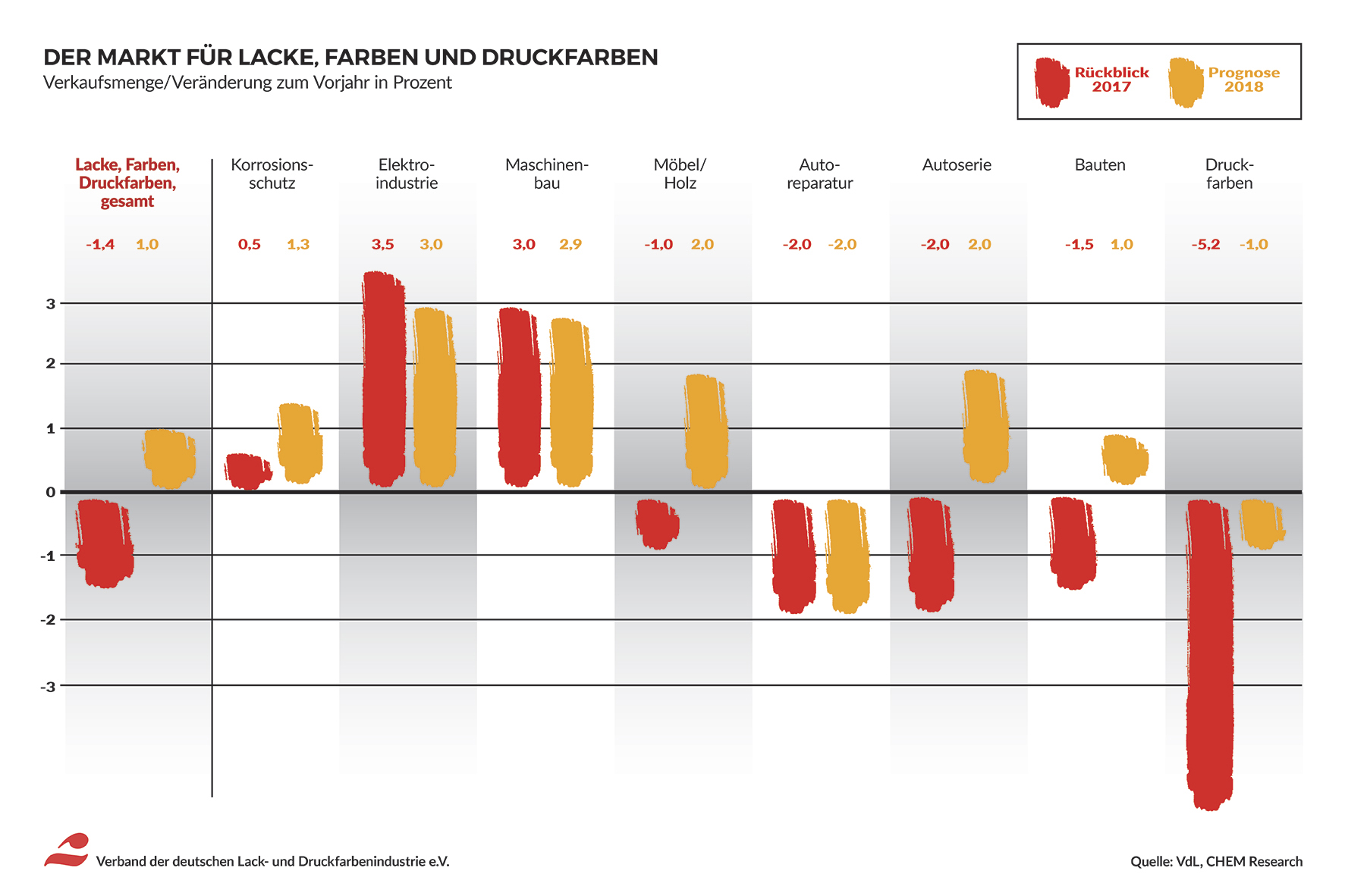 Für das Jahr 2018 erwartet der VdL eine moderate Belebung der Absatz- und Mengenzahlen in allen drei Segmenten. Die gut laufende Konjunktur im industriellen Sektor wird andauern, hier sind Zuwächse von über 2 Prozent in Sicht. Auch bei den Bautenfarben wird eine leichte Belebung des Geschäfts erwartet – im Nachlauf der enorm gestiegenen Bautätigkeit sind 2018 mengenmäßig durchaus Zuwächse von einem Prozent denkbar. Allein bei den Druckfarben wird es wohl auch im kommenden Jahr bei der Nachfrage wieder ein leichtes Minus geben.