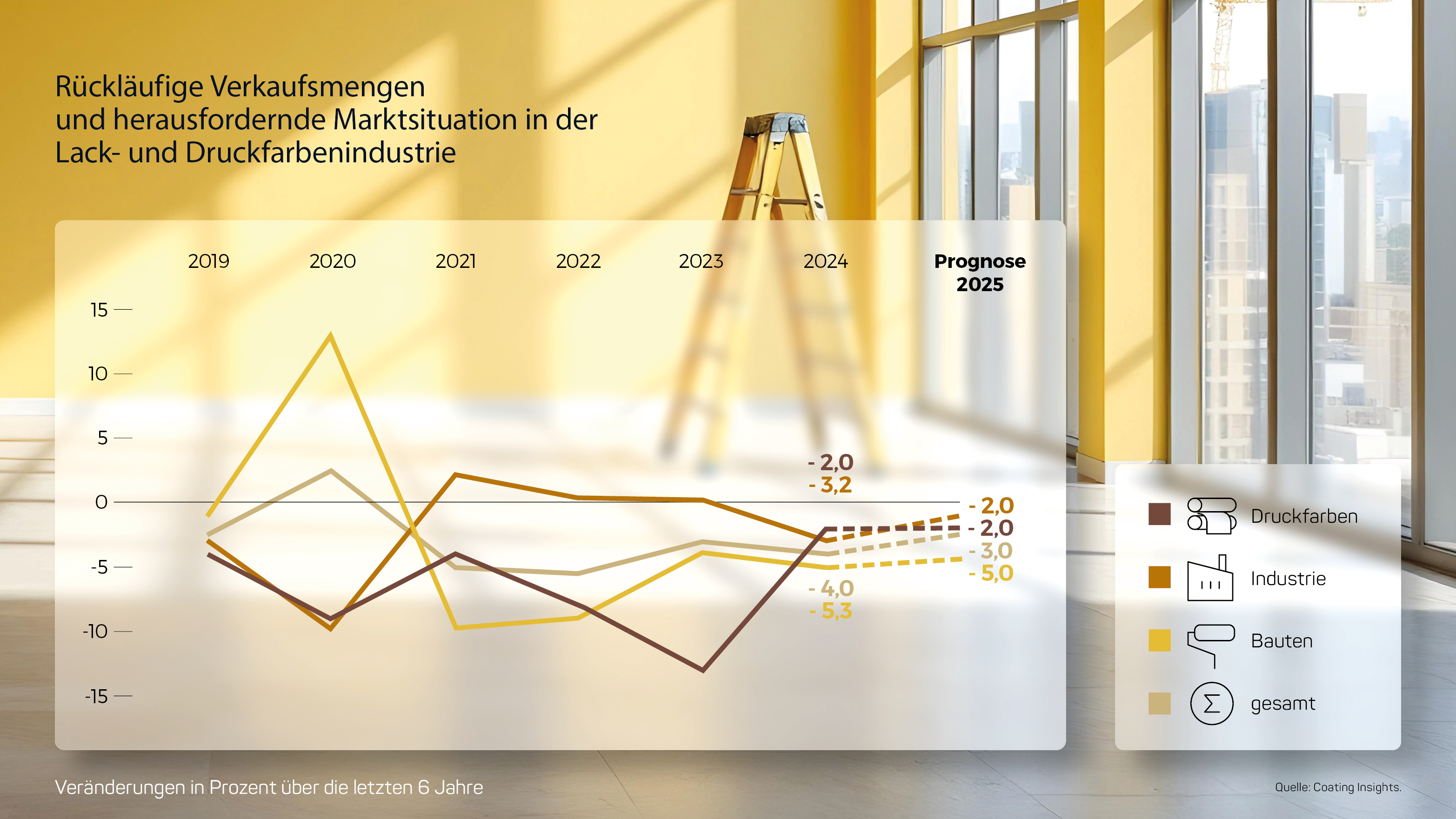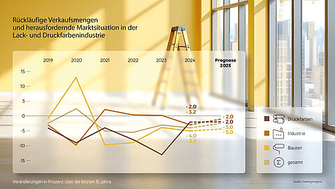 Die Verkaufsmenge von Lacken, Farben und Druckfarben in Deutschland sank 2024 um 3 % auf 1,4 Mio. Tonnen (5,9 Mrd. €). Die Branche leidet unter der gesamtwirtschaftlichen Schwäche, Druckfarben und Bautenanstrichmittel belasten den Markt. Der VdL erwartet für 2025 einen weiteren Rückgang um 2,5 %. Zusätzliche Unsicherheiten entstehen durch mögliche US-Zollerhöhungen und die wirtschaftspolitische Ausrichtung nach den deutschen Neuwahlen im Februar.