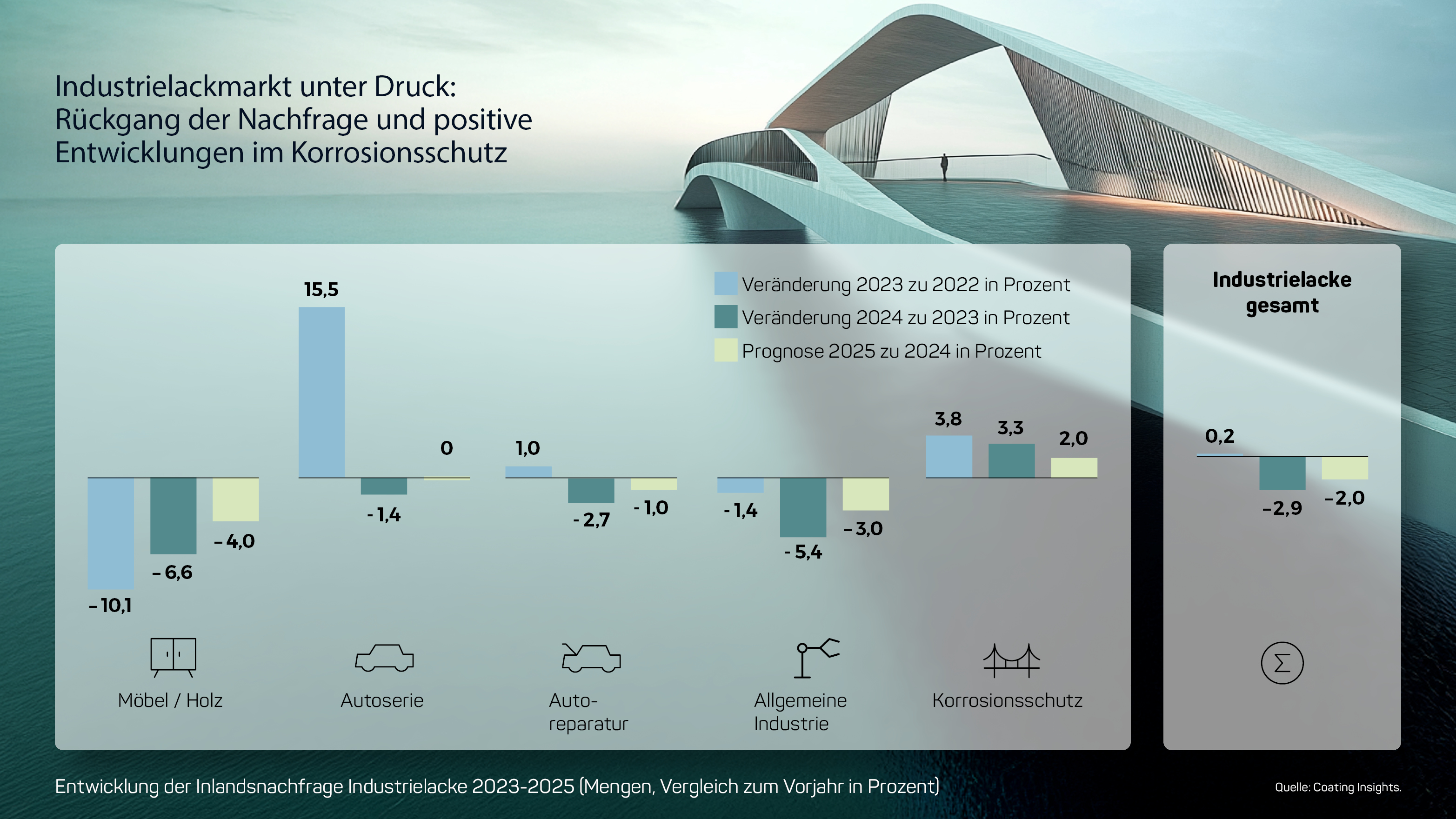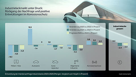Die Schwäche des verarbeitenden Gewerbes belastet den Markt für Industrielacke. 2024 sank die Inlandsnachfrage um 2,9 %, insbesondere durch Rückgänge bei Möbel & Holz (-6,6 %) und der allgemeinen Industrie (-5,4 %). Für 2025 wird ein weiterer Rückgang um 1 % erwartet. Ein Lichtblick bleibt der Korrosionsschutz, der dank staatlicher Infrastrukturprojekte und Windkraftanlagen um 2 % wachsen dürfte.