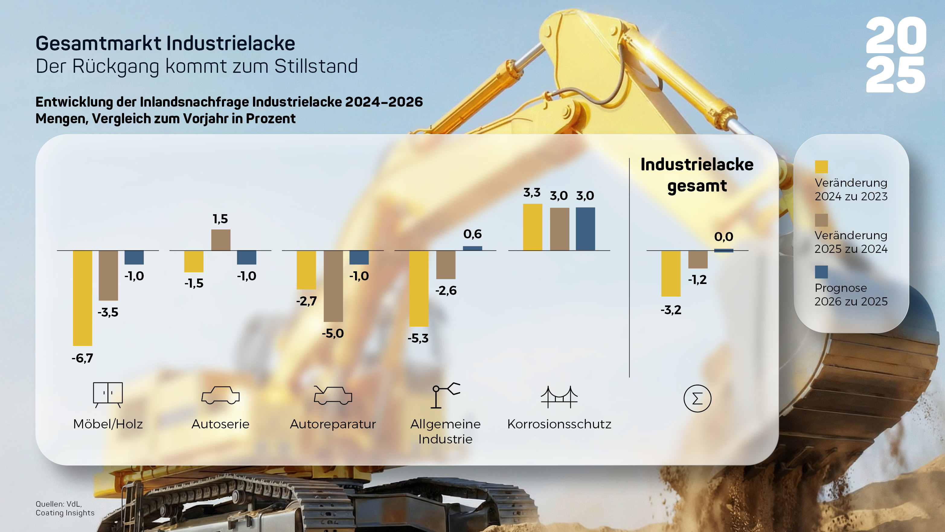Die Inlandsnachfrage bei Industrielacken ist 2025 um 1,2 % geschrumpft. Ursächlich sind die Rückgänge im Bereich Möbel und Holz (-3,5 %), in der allgemeinen Industrie (-2,6 %) und bei den Autoreparaturlacken (-5 %). Von einem kleinen Wachstum von 1,5 % konnte man bei den Autoserienlacken berichten. Ausreißer bleiben die Korrosionsschutzbeschichtungsstoffe (3 %). Jedoch ist dieses inzwischen solide Wachstum zum großen Teil auf staatliche Infrastrukturprojekte in Sachen Energie, Verkehr und Straßenbau zurückzuführen. Für 2026 erwartet der VdL immerhin eine schwarze Null in diesem wichtigen Bereich, einer der wenigen Lichtblicke.