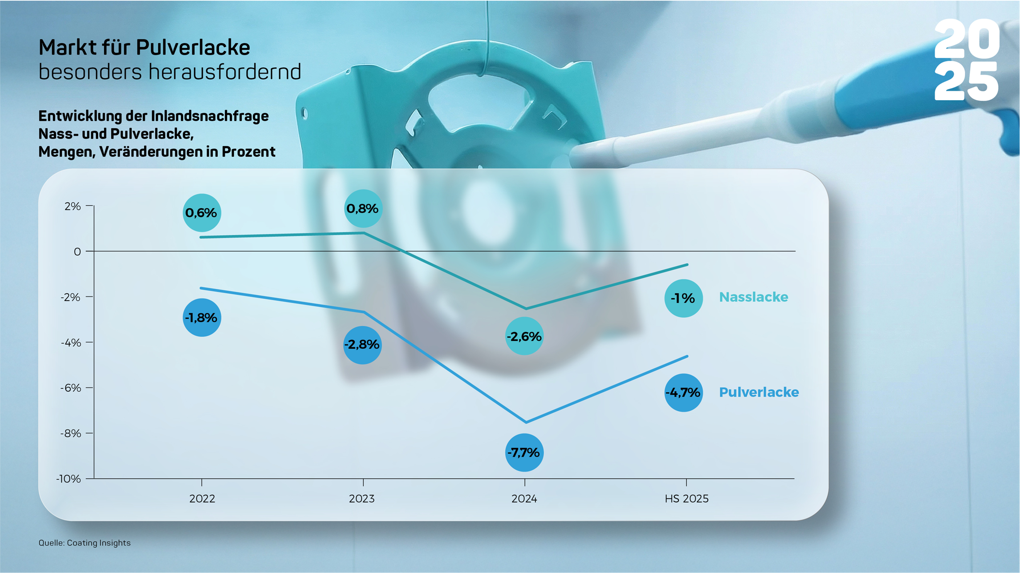 Pulverlacke machen etwa 12 % des Gesamtumsatzes der Industrielacke in Deutschland aus. In den letzten vier Jahren fielen die Rückgänge hier stärker aus als bei den Nasslacken. Rund die Hälfte der Pulverlackanwendungen entfiel 2025 auf den Automobilzulieferer- bzw. Transportbereich und auf den Bau. Während die Nachfrage nach Nasslacken 2025 nur um etwa 1 % zurückging, sank die Nachfrage nach Pulverlacken um etwa 5 %.