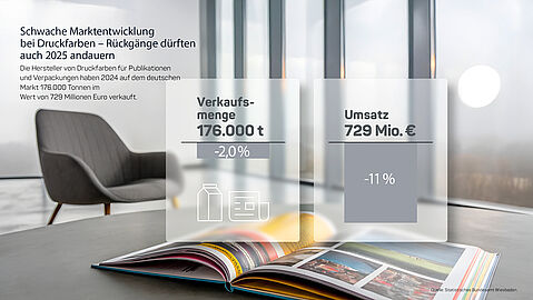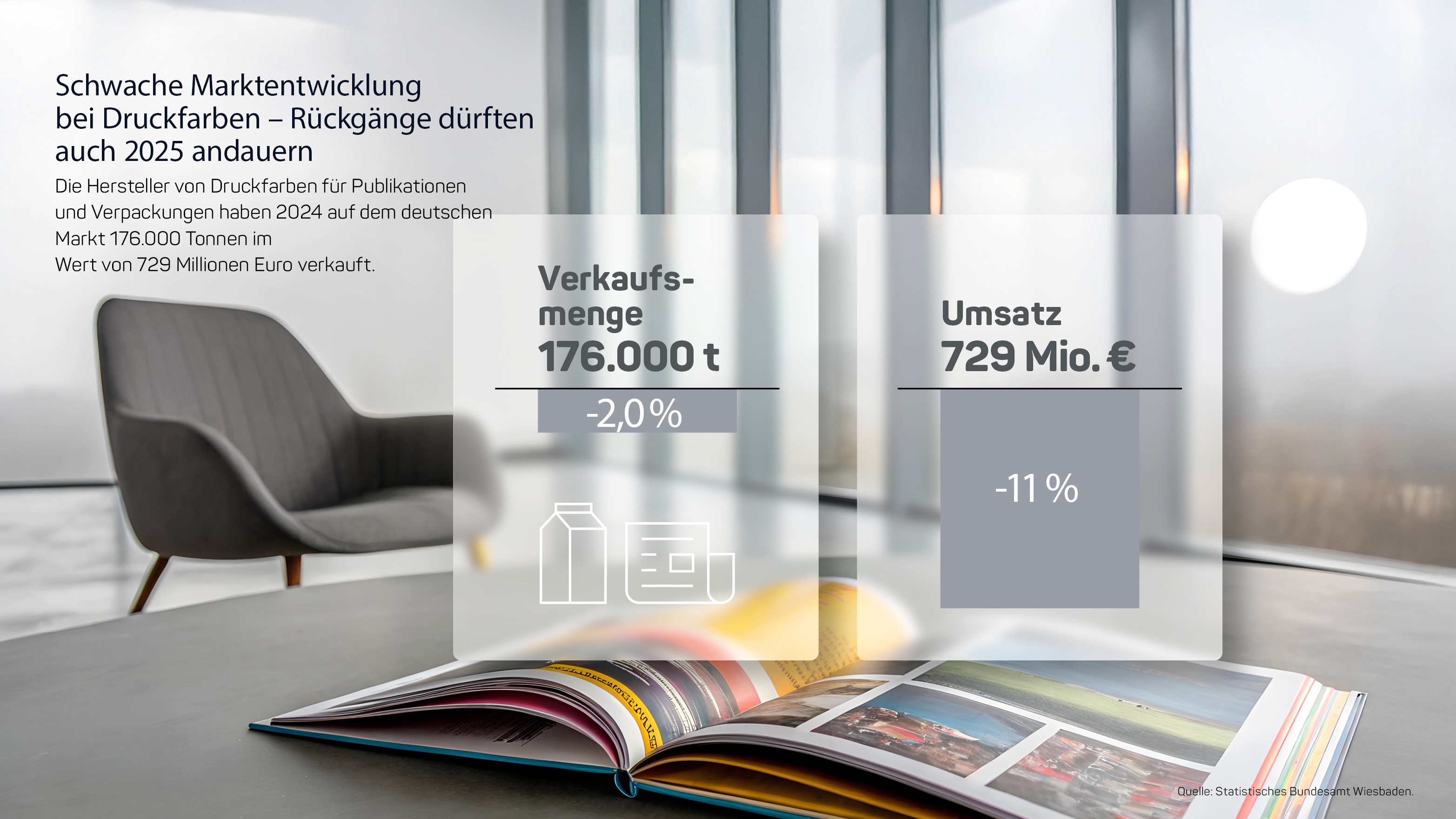 2024 wurden in Deutschland 176.000 Tonnen Druckfarben für 729 Mio. € verkauft, 2 % weniger als 2023. Während der Verpackungsdruck wuchs, sank die Nachfrage im Publikationsdruck. Für 2025 wird ein weiterer Rückgang um 2 % erwartet, hauptsächlich durch die anhaltende Schwäche im Publikationsdruck.
