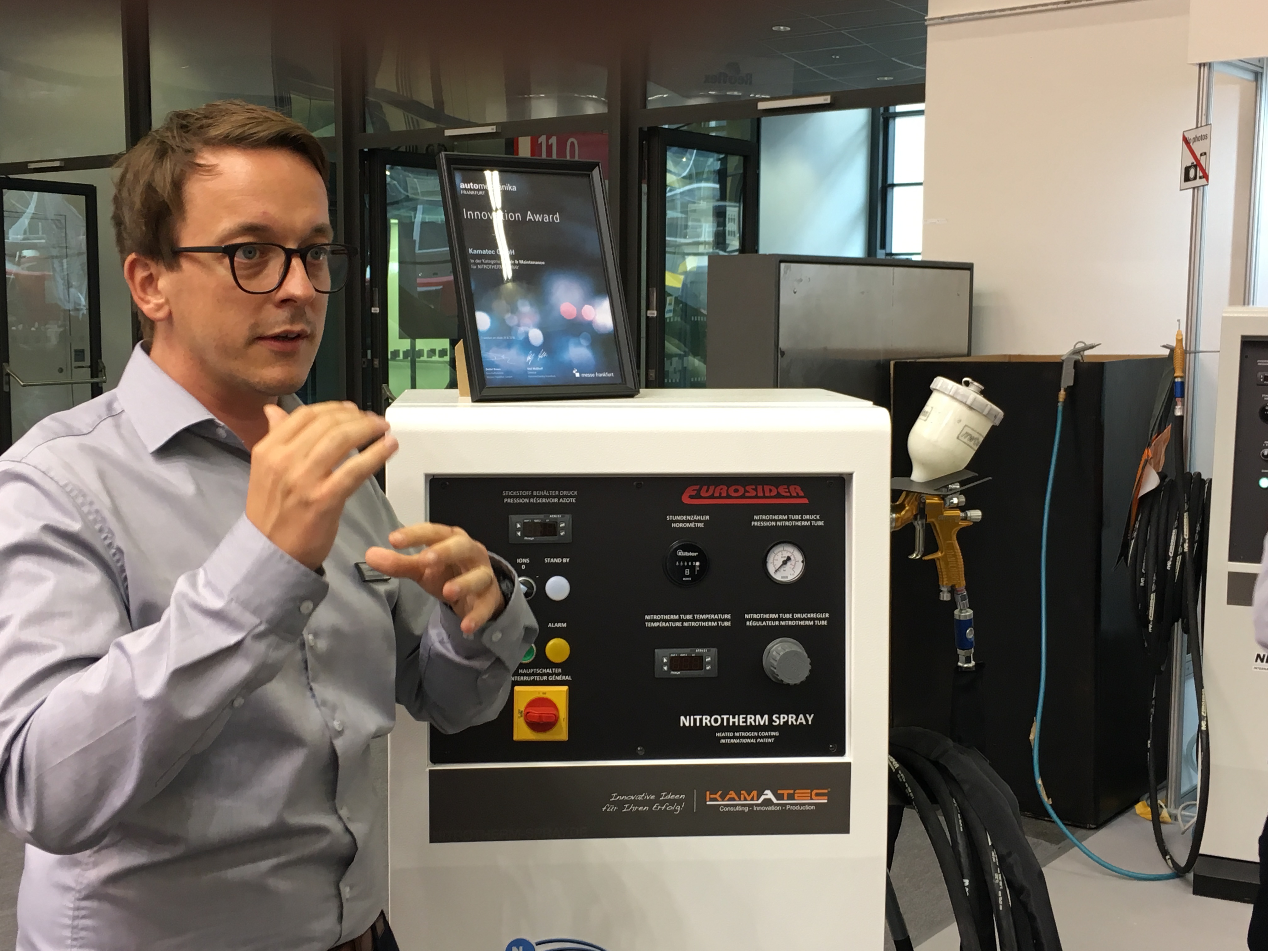 Wenige Messe-Stände weiter: Manche Dinge sind erstaunlich einfach und haben doch eine revolutionäre Wirkung, wie beispielsweise das Konzept Nitrotherm eines deutschen Herstellers. Bislang wird in herkömmlichen Lackierkabinen der Lack mittels Spritzpistolen aufgebracht, die mit Hilfe von Druckluft den Lack auf die Karosserie sprühen. Diese Druckluft setzt sich aus den Bestandteilen zusammen, die auch in der normalen Umgebungsluft enthalten sind. Das Konzept, das auf der Automechanika mit dem „Innovation Award“ ausgezeichnet wurde, basiert auf der Verwendung von nahezu reinem Stickstoff statt Atemluft. Die Effekte für den Lackiervorgang sind erstaunlich: der Lackverbrauch sinkt, gleichzeitig steigt die Qualität der Lackierung. Woran liegt das? Die Bestandteile in der normalen Luft, wie beispielsweise Edelgase, Feuchtigkeit oder kleinste Festkörperpartikel, können das Lackierergebnis negativ beeinflussen. Diese Effekte werden bei der Verwendung von Stickstoff vermieden. Durch die zusätzliche Ionisierung und Erwärmung des Stickstoffs wird der Lack geradezu vom Karosserieteil angezogen, so dass außerdem weniger Overspray anfällt, Lack, der verschwendet ist, weil er nicht auf der zu lackierenden Oberfläche landet.